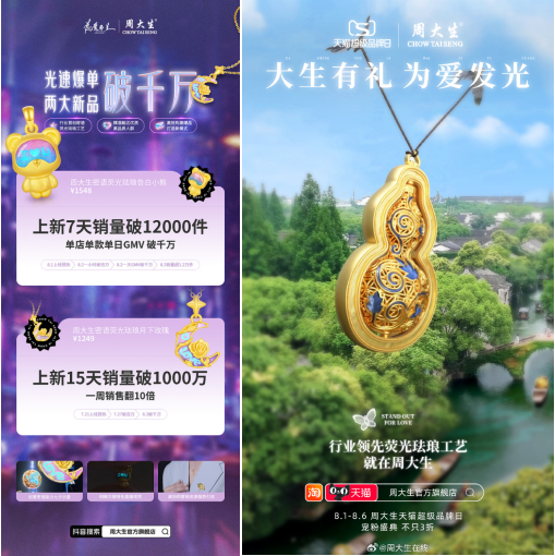 今年七夕,国民珠宝品牌周大生以“大生有礼,为爱发光”为主题,讨论关于“爱”的命题。品牌将光作为“爱的媒介”,震撼发布了行业领先的荧光珐琅工艺新品——“会发光的金子”,并同步官宣任嘉伦为全球品牌代言人的身份,借势周大生天猫超级品牌日开展了线上到线下的一系列主题营销活动,汇集了国家级媒体、明星、多平台优质达人等资源,以产品为本,成功打造了一次颠覆品牌传统的七夕营销事件,并在销售端交付了一份亮眼的成绩:周大生官方旗舰店天猫超级品牌日成交额突破3亿,并跃居天猫珠宝服饰行业排名TOP1;8.1-8.10日周大生电商全渠道累计退前GMV 5.5亿。