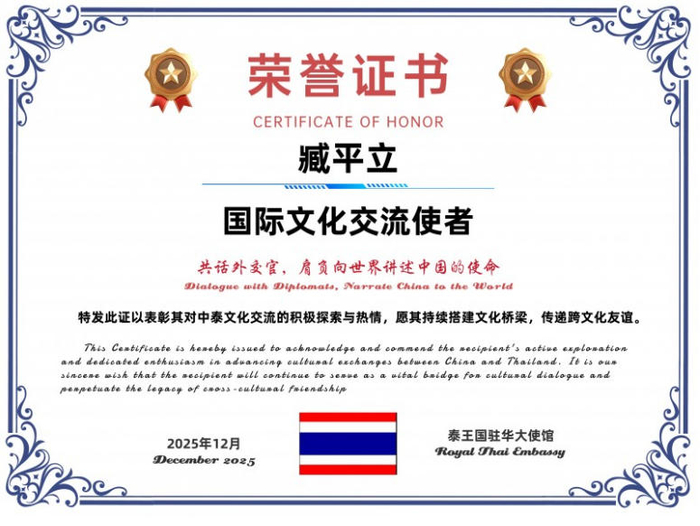 近日,名中医臧平立被授予“国际文化交流学者”荣誉称号。泰王国驻华大使馆在颁发的荣誉证书中写道:“特发此证以表彰其对中泰文化交流的积极探索与热情,愿其持续搭建文化桥梁,传递文化友谊。”该证书由泰王国驻华大使馆于2025年12月颁发。