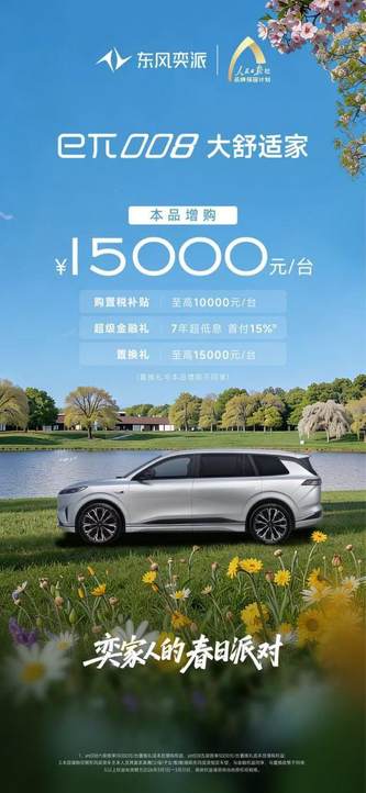 奕派008作为东风奕派专为多孩家庭打造的大家庭智能座驾,以“真满配、真智能、真超值”的全能实力,精准适配不同家庭出行场景。超5米车长、3米轴距的旗舰尺寸,提供纯电及增程两种动力选择,充分满足消费者“既要又要还要更要”的家庭出行高要求。现在购买奕派008,可尊享至高10000元购置税补贴、至高15000元置换补贴以及7年超低息、首付15%等金融方案,轻松开启美好的新春出行生活。