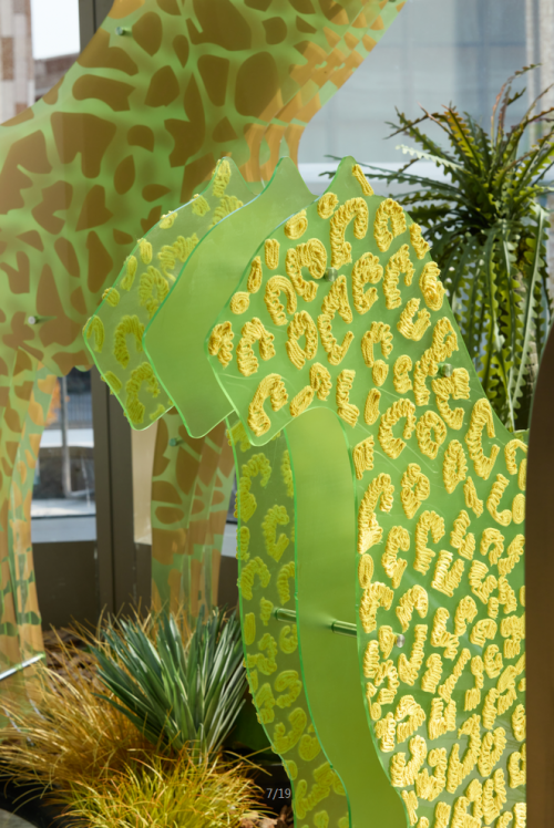 绿洲主题的艺术装置生动诠释自然的多样性与和谐。雪豹、斑马、长颈鹿等动物形象与沙漠植物共同营造出一幅充满生机的微型生态系统,其斑纹和肌理采用可持续环保材质制作,赋予摩登艺术独特魅力,传递品牌对于人与自然和谐共生的深刻思考。