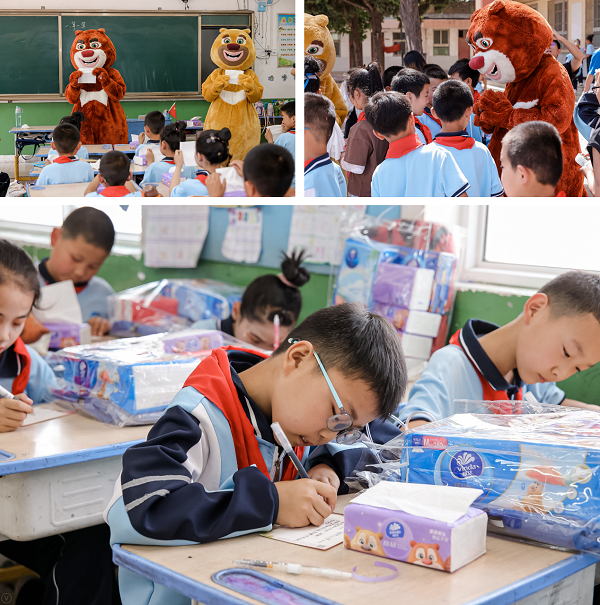 本次活动除了联合纯山共同打造“鞋盒礼物”*,为学生们捐赠了学习用具、卫生用纸等生活物资,维达还把孩子们喜欢的动画《熊出没》里的“熊大熊二”从荧幕里带到了校园里,现场熊大熊二通过带孩子们一起做“擦手操”向他们普及卫生健康知识,除此之外,还与孩子们一起互动玩游戏,陪伴他们度过了一个快乐而难忘的儿童节。