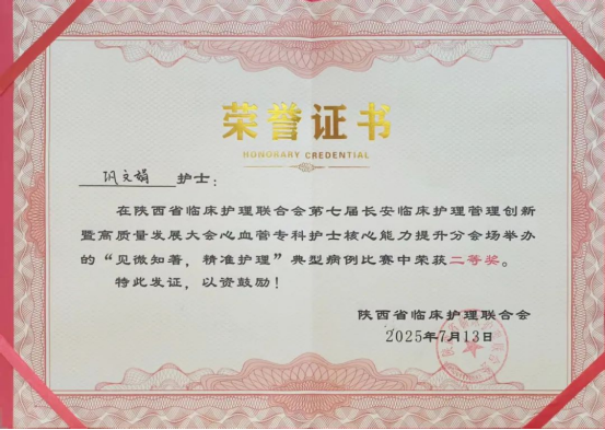 7月13日,第七届长安临床护理管理创新暨高质量发展大会心血管专科护士能力提升分会病例比赛落幕。由商洛市中心医院B-6(心血管内科一病区/中医科)护理单元巩文娟代表参赛的案例《救“心”循证护“心”入微——一例急性心肌梗死合并多并发症患者的个案护理》,在众多参赛作品中脱颖而出,荣获二等奖。