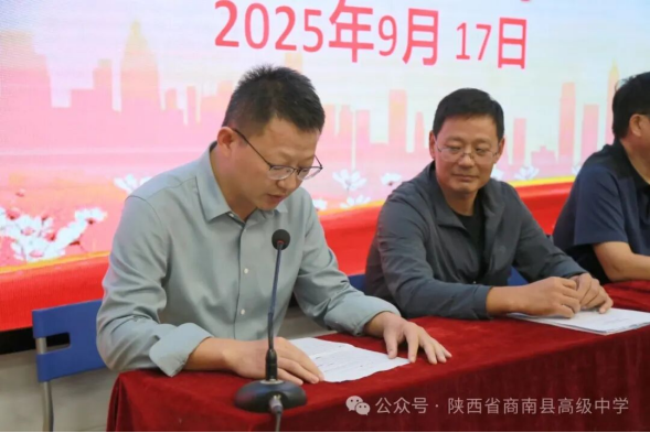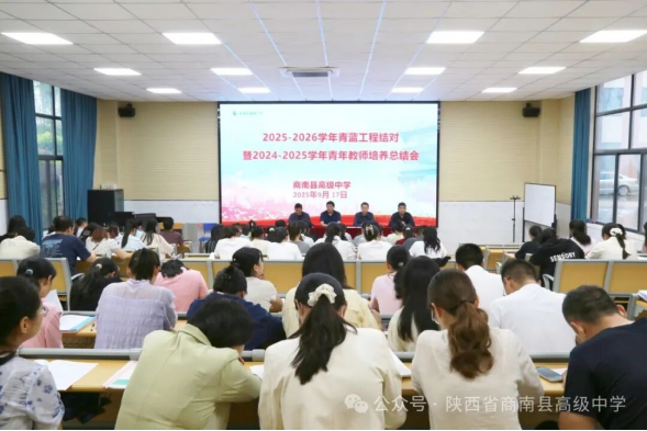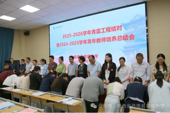 为加速青年教师成长,壮大骨干队伍,提升教师整体素质,商南县高级中学于9月17日召开2025—2026学年青蓝工程结对暨2024—2025学年青年教师培养总结会。校长、教研室负责人、指导教师代表及全体青年教师近百人参会,共同见证新的师徒结对,一起分享一年来的收获成长。会议由教研室主任王育生主持。