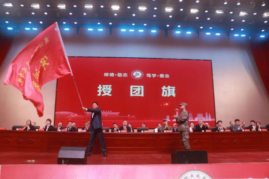 《强军战歌》起,刘勇挥舞军训团旗,庄重地向2025级新生军训团授旗,代先平代表军训团接旗,台下掌声雷动,将本次动员会推向高潮。
