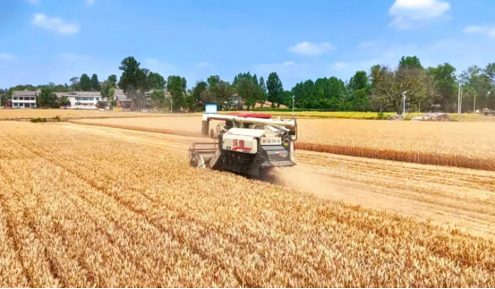 何村小麦实验田上,收割机正在田间来回穿梭作业。