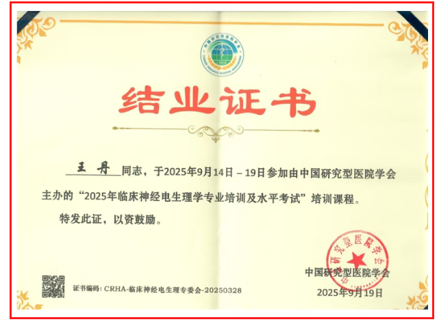 近日,由中国研究型医院学会主办、国家卫生健康委员会人才交流中心合作开展的首次全国性“2025年临床神经电生理学专业培训及水平考试”在北京落幕,商洛市中心医院电生理科主治医师王丹与全国500余名电生理专业人员参加培训并以优异的成绩取得结业证书。
