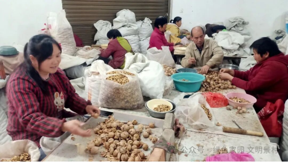 刚送完孩子上学,返回自己工位的王春玲一边娴熟地剥核桃皮、一边开心地说,“剥核桃仁这活儿门槛低、难度小,我通常在忙完自家事务后才抽空来这里剥核桃,最后按核桃果的重量结算工资,我一天都能有50到60元的收入。”
