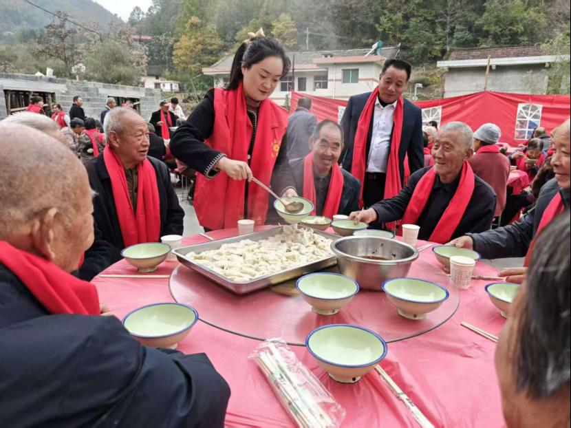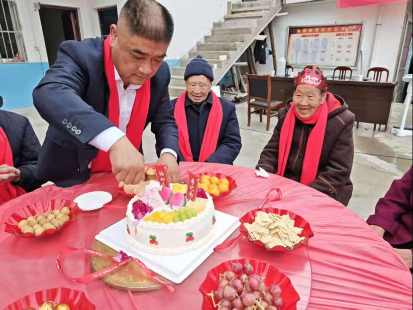 美食盛宴,凝聚邻里乡情。清泥村两委干部、党员志愿者、热心村民早早齐聚活动现场,调馅、和面、包饺子,分工协作,配合默契,欢声笑语驱散了秋日微凉。随着热气腾腾的饺子出锅,志愿者们将一碗碗饱含深情与祝福的饺子送到老人们手中,滚烫的香气里裹挟着浓浓的关爱,老人们脸上洋溢着幸福满足的笑容。活动现场更藏着暖心惊喜——为当月过生日的八位老人集体庆祝生日,全场合唱生日歌,志愿者为他们送上精心准备的大蛋糕和慰问品。宴席之上,鸡鸭鱼肉等佳肴摆满餐桌,老人们围坐畅谈,闲话家常,醇厚的乡情在饭香氤氲中愈发浓烈,邻里情谊在欢声笑语中愈发深厚。