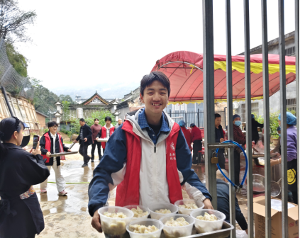 此次活动的显著亮点,是校团委主动对接古镇社区“水饺宴”活动,并组织学生志愿者参与服务。志愿者为老党员、独居及残疾老人端茶送水饺,宴后还主动清扫场地,以实际行动彰显校社联动成效。