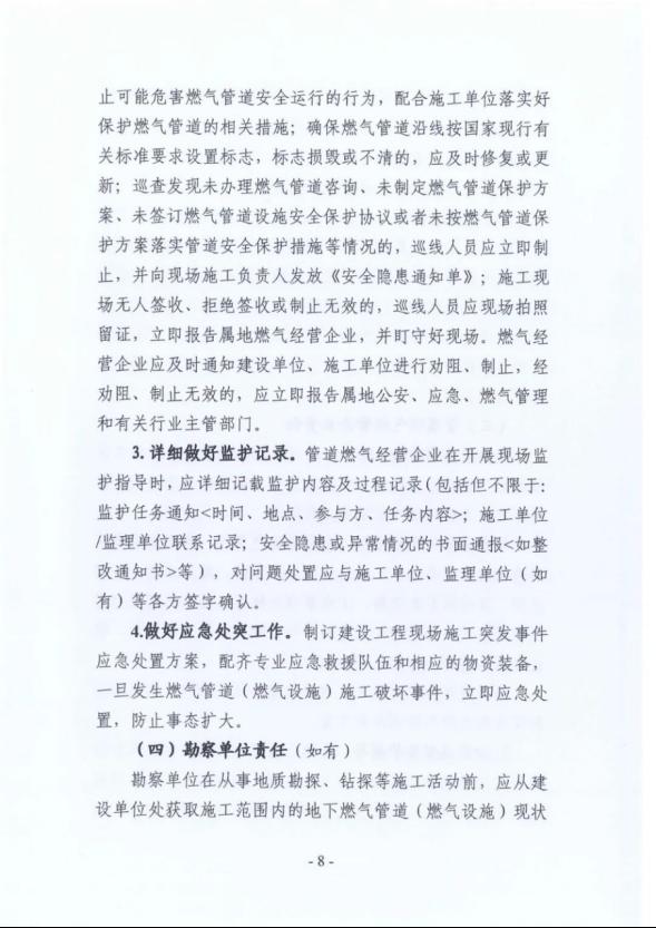 该《机制》共包含六个方面内容,适用于非燃气管道权属(产权)单位或个人在城市燃气管道(燃气设施)划定的保护范围内或控制范围内进行的各类工程施工行为。明确了燃气管道(燃气设施)周边施工项目涉及到的相关部门单位、专业经营企业、属地街办安全监管责任,厘清了燃气管道(燃气设施)周边施工项目参建各方(建设、监理、施工、设计单位)和燃气经营企业安全责任。同时,建立实施燃气管道(燃气设施)周边动土作业联合审签制度和涉燃项目动态台账管理制度,实行全过程跟踪监管,严厉打击第三方施工破坏燃气管道设施违法违规行为,推动燃气管道保护工作全链条监管。