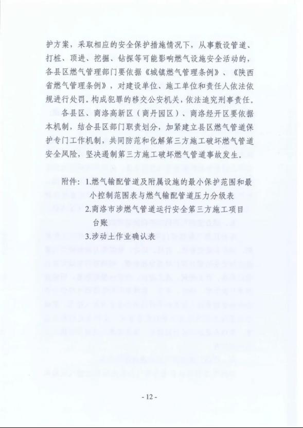 为认真贯彻落实习近平总书记关于安全生产重要论述和燃气安全的重要指示批示精神,中省市关于群众身边不正之风和腐败问题集中整治—“整治城镇燃气安全问题”具体实事工作要求,扎实推进城镇燃气安全专项整治长效机制建立工作,加强燃气设施保护,严防第三方施工破坏,确保燃气管道安全运行,近日,商洛市印发了《商洛市防范第三方施工破坏城市燃气管道工作机制》。