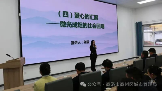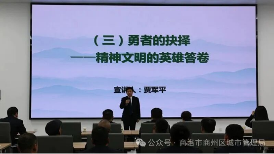 让善举延续,精神永存。商州区城管局党组成员、区城管综合执法大队大队长房涛指出,五位宣讲老师的讲述字字句句饱含对英雄的敬意,更传递出传承英雄精神的责任与担当。老师们的宣讲与倡议,不仅是对英雄的颂扬与告慰,更是对全体城管人员的鞭策与激励。他强调,城管系统全体干部职工要将英雄精神转化为“强基础、转作风、树形象”的实际行动,落实到守护城市整洁、保障市民安宁、服务群众需求的具体举措中,把英雄精神内化为爱岗敬业、用心服务群众的岗位实践,以更扎实的作风为商州经济社会发展贡献力量。