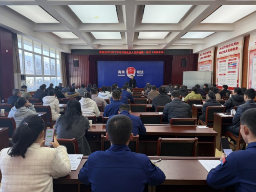 此次考试由商洛市司法局统筹组织,严格按照《陕西省司法厅关于进一步优化行政执法人员资格证件审批制度的通知》要求,聚焦习近平法治思想,行政执法和执法监督有关法律法规规章、业务规范和实操技能,重点考查考生对行政处罚、行政强制、行政许可等基础法律知识的掌握程度,以及运用法律解决实际执法问题的能力。考试采取“人员集中、扫码入网、线上答题”的方式进行,为确保考试顺利开展,市、县区司法局按照“从严治考、规范管理、热情服务”的工作原则和“严密组织、严谨程序、严格标准、严明纪律”的工作要求,精心组织、周密安排,均成立了由主要领导任组长的考务组和监考组,确保考试各项工作顺利开展。省司法厅督巡考组对我市考试各项工作进行督导。考试期间,考场内秩序井然,考风考纪良好,整体安全、平稳、有序。