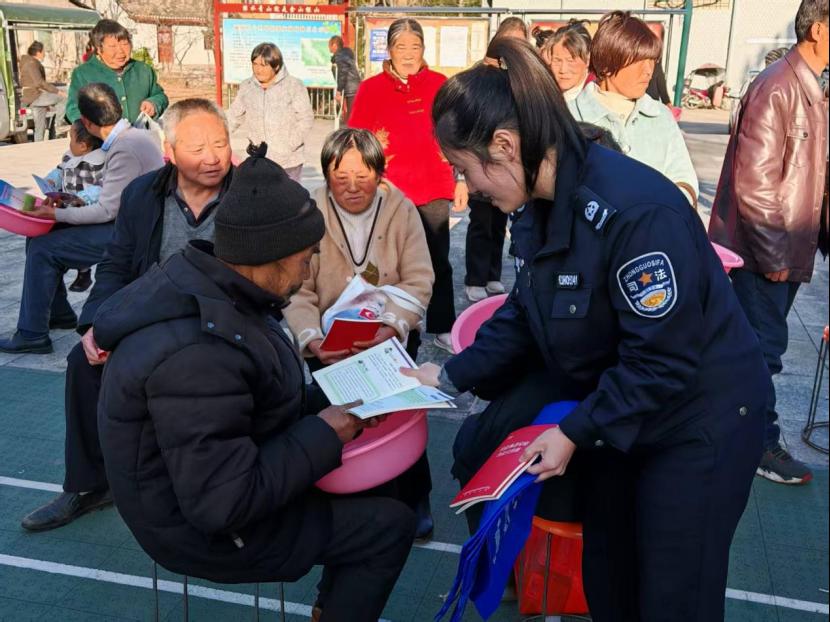 活动中,商南县剧团还带来了文艺汇演,悠扬的唱腔与精彩的剧情瞬间将现场氛围推向高潮。演出节目紧扣平安建设主题,演员们的表演赢得村民阵阵掌声,让平安理念在欢声笑语中深入人心。十里坪司法所工作人员也迅速进入“互动服务模式”,化身法治宣传员,为群众送去《民法典》等法律读本,用接地气的语言讲解与日常生活息息相关的法律知识:“大家看刚才剧团演的家庭伦理剧,里面提到的赡养老人问题,在咱们《民法典》里可是有明确规定的,子女必须履行赡养义务,要是遇到相关纠纷,随时能找我们司法所帮忙调解!”生动的讲解结合剧情,让法律知识不再枯燥,引得不少群众主动提问。