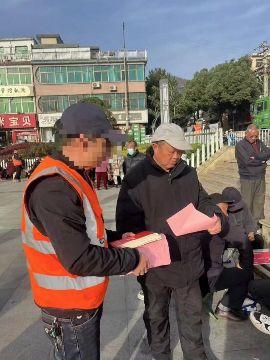 警示片观看结束后,为将法治教育与社会服务深度融合,司法所工作人员带领社区矫正对象前往辖区中心广场开展平安建设普法宣传活动。从“被教育者”自觉转变为“宣传者”,角色的转变让社区矫正对象更深刻地体会到了社会责任,也增强了他们融入社会、服务社会的信心与决心。