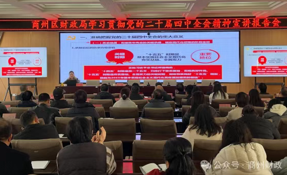 12月10日上午,商洛市商州区财政系统召开学习贯彻党的二十届四中全会精神专题宣讲报告会,特邀区委党校讲师张思雨同志作专题辅导。局领导班子成员、局属单位负责人、各财政所长及全体干部职工参加学习,共同深学细悟全会精神,凝聚起以全会精神为引领,进一步推动财政工作提质增效的思想共识与行动力量。