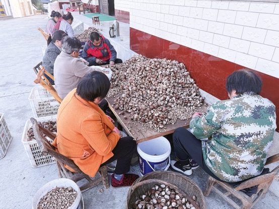 11月19日,村民正在加工(剪菌柄)、分拣刚采收回来的香菇