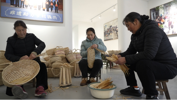 12月10日,在位于洛南县保安镇的巧手工艺品有限公司厂房里,仓圣社区居民李金娥和几名妇女正在编织草编制品。寻常的苞谷叶和小麦秸秆在她手中经过一番上挑下穿,不一会儿一个精致的玩具篮就初具雏形。