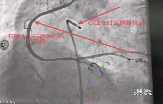 患者心功能极差、心房纤颤、心动过缓,处于心源性休克状态,需依靠升压药物维持血压,为保障介入手术顺利进行,刘仲伟教授决定立即行临时起搏器植入以防止心源性猝死的发生,起搏器植入后顺利在闭塞的右冠主干植入导丝,先行冠状动脉内血栓抽吸取栓及冠状动脉内溶栓术,再行球囊扩张后顺利开通右冠并植入支架,术后IVUS检查显示支架贴壁良好,血流恢复至TIMI3级,手术完美结束。术前心电图系急性ST段抬高型心肌梗死+心房纤颤,术后心房纤颤转复为窦性心律,ST段较前回落!上级教授精湛的冠脉介入技术带给了患者福音,术后患者胸痛症状即刻缓解,心房纤颤转复为窦性心律后血压逐渐恢复正常,转入监护病房进一步康复,本次救治过程充分体现了现代介入手术“及时、精准、微创、安全、高效”的显著优势。