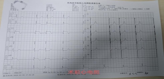 时间回溯到2026年1月5日,丹凤县中医医院“云心电”发现一例急性心肌梗死患者,心内科立即电话联系,得知患者为78岁女士,以“突发剧烈胸痛、头晕、呕吐”为主要症状,口服药物无缓解,拟转外院治疗,经医院心内科联系后,由镇卫生院紧急送至我院心血管内科。接到通知后心内科主任姜波立即启动“胸痛绿色通道”,做好急救准备,一场与死神赛跑的较量就此展开。