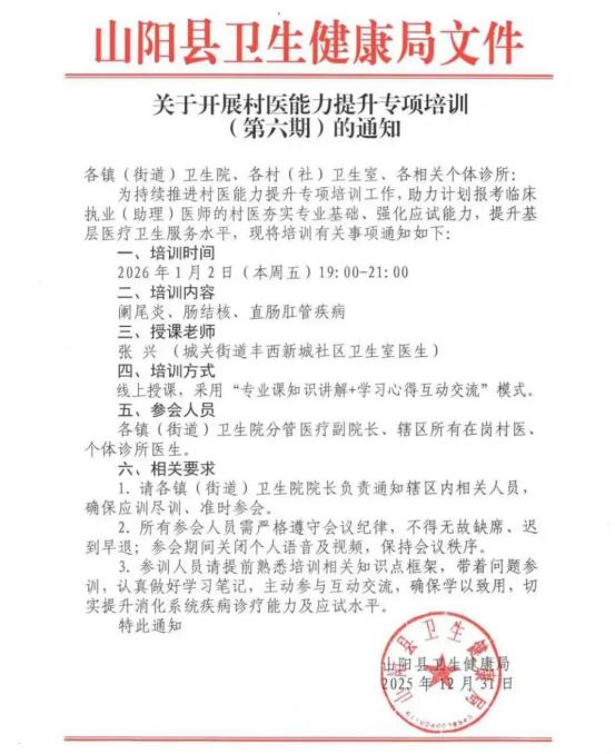 为确保培训实效,采用“线上授课+互动赋能”的灵活模式,每期培训均设置“专业知识精讲+政策案例分析+实操心得分享+现场答疑解惑”全流程环节,要求参训人员提前梳理工作疑点、熟悉知识点框架,带着问题学、结合实践悟。同时明确纪律要求,参训人员需全程关闭语音及视频,保持良好会议秩序;各镇(街道)卫生院院长牵头负责辖区人员通知工作,确保符合报考条件的村医、个体诊所从业人员及有提升意愿的医务人员“应训尽训、全员覆盖”,让培训红利直达基层医疗服务“神经末梢”。此次培育体系的构建,是深化基层医疗改革的重要举措。此前,已通过与西安交通大学第一附属医院等上级医院开展“组团式”帮扶、出台《山阳县人才强卫十条措施》、建设名老中医药专家传承工作室等多重举措,为基层医疗人才成长铺路搭桥。而“持证带教+固定培训+职务赋能”的创新模式,进一步激活了本土人才“传帮带”的内生动力,让基层医务人员无需远行就能便捷学、精准学,通过“学用结合”快速提升诊疗服务能力与执业考试应试水平,为持续壮大高素质基层医疗队伍提供了坚实支撑。下一步,山阳县将持续优化培育体系,动态调整培训课程以适配基层医疗服务新需求,完善村医考核与激励机制,推动“本土人才培育+基层服务提升”良性循环,让更多优秀基层医务人员成长成才,为全县群众的健康福祉筑牢坚实屏障。