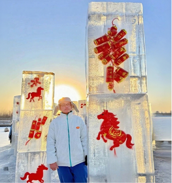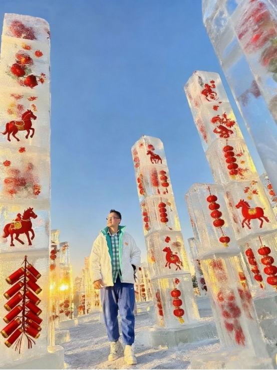 索道上站放置十二组冰柱,内含鞭炮、福、灯笼、吉祥马,与五色梦马组合成马年吉祥画卷,是拍照互动打卡的绝佳选择。