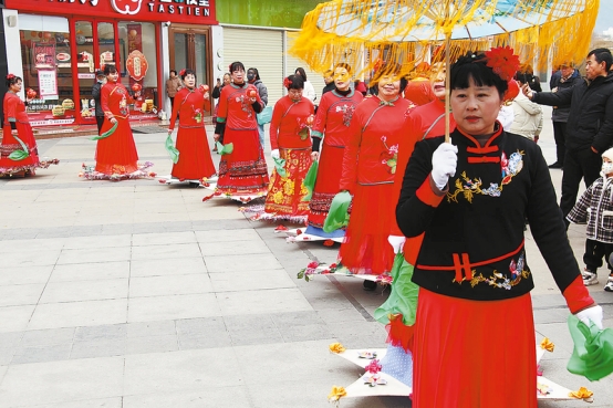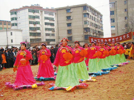 腊月时节,夜幕四合。商洛市商州区刘湾街道郭王村的小广场上,锣鼓声打破了乡村的寂静。昏黄路灯下,数十名女子排列成阵,身着独特的六角形彩裙,左手托花灯、右手执绢帕,身体随着鼓点徐行,裙裾之下却不见脚步交替,整个人仿佛在云端之上御风飘行。