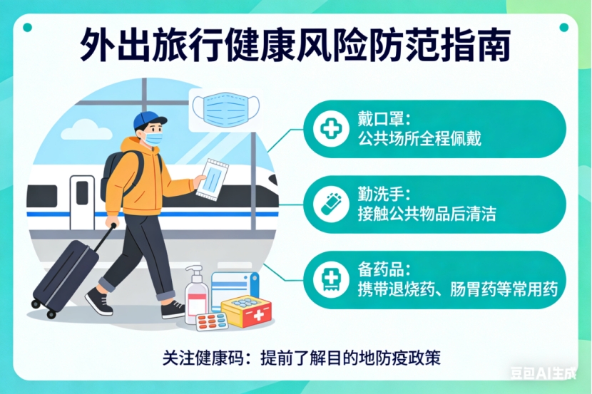 ✅ 出行前了解目的地疫情和传染病情况,备好口罩、消毒用品、常用药,必要时提前接种疫苗;