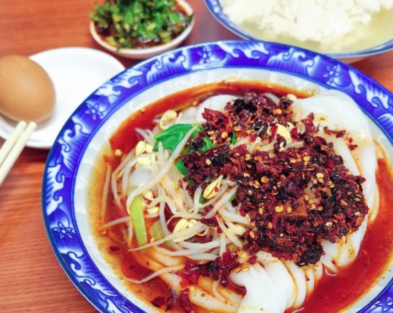 热米皮则是另一种温柔。刚从蒸笼揭下的米皮白嫩软糯,浇上特制的辣椒油和料水,热乎乎下肚,从舌尖暖到胃里。若是天冷,再配一碗滚烫的菜豆腐,或是茶叶蛋,便是妥帖的一餐。