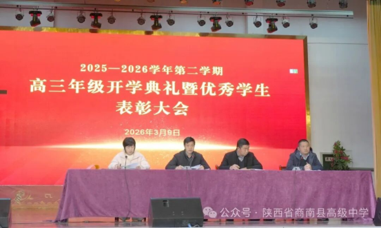 春潮涌动处,奋进正当时。为精准锚定新学期育人目标,发挥榜样示范引领作用,近日,商南县高级中学分时段、分批次在学校大礼堂举行2025-2026学年第二学期开学典礼暨优秀学子表彰大会。高一、高二、高三全体师生分场参会,学校领导班子成员、各年级负责人出席活动。