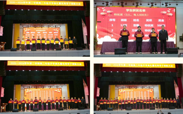 各年级主管和级部主任为获奖班级及个人颁发荣誉证书和奖金,金色的证书在灯光下熠熠生辉。现场掌声雷动,既是对优秀学子的诚挚祝贺,也彰显了全体师生见贤思齐、奋勇争先的坚定决心。