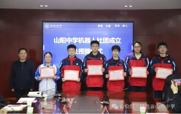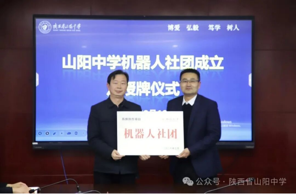 科技点燃梦想,创新成就未来。为充分发挥捐赠设备价值,培养学生科创素养,山阳中学首届机器人社团正式成立。副校长苏汉民为社团授牌,标志着我校科创教育体系再添新阵地,学生多元发展平台进一步完善。