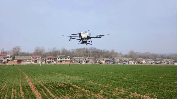 与此同时,在该合作社流转承包的另一块田地里,一架载重100公斤的农用无人机腾空而起,在操作手的熟练操控下平稳悬停于麦田上空,按照提前设定好的航线匀速飞行。在机身下方的播撒装置开启后,肥料均匀地喷洒在麦苗行间,飞行路线笔直规整,作业区域全覆盖无死角,短短两分钟便完成一亩地的施肥任务。