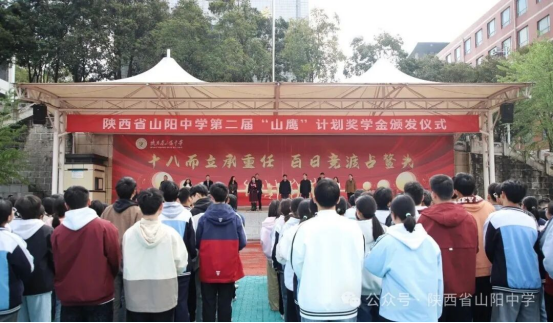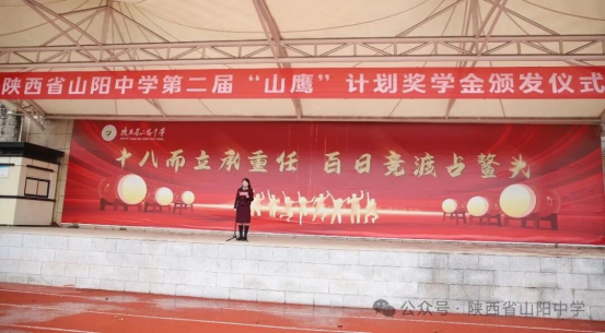 3月30日上午,陕西省山阳中学第二届“山鹰”计划奖学金发放仪式在北校区操场举行。山阳中学校长邵志诚,副校长苏荣久、苏汉民,党委副书记曹妮,山鹰计划奖学金爱心校友代表陕西省山阳县东之蕾商贸有限公司总经理蔺旭东,长安大学副教授信息工程学院学生工作办公室主任周平,西安沃图电子科技有限公司副总经理雷丽,重庆图书馆馆员刘新菊,商洛学院继续教育学院副院长教授杨艳,山阳县棚户区改造办公室工程师郝小淞参加了活动,本次活动由山阳中学资助中心主任曹亚娜主持。