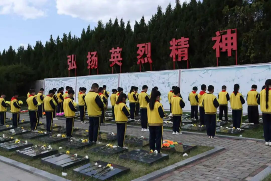 活动现场松柏苍翠,丰碑矗立,全体人员神情肃穆,整齐列队于纪念碑前。伴随着激昂的旋律,少先队员昂首挺胸,齐声高唱《中国少年先锋队队歌》。随后,党员代表缓步走向纪念碑,郑重敬献花圈。在庄严肃穆的氛围中,全体人员低头默哀三分钟,共同向为民族解放和人民幸福英勇献身的革命烈士致以最深切的哀悼。默哀毕,少先队员代表、街道领导及学校领导先后发言,大家分别从不同视角,深情追忆革命先烈的光辉事迹,表达了要刻苦学习、赓续红色血脉,立足岗位、拼搏奉献的坚定信念。最后,全体人员怀着崇敬之情,依次走向烈士墓区,手持鲜花逐一敬献,并深深三鞠躬,表达对先烈的崇高敬意。整个祭扫过程庄重肃穆,流程井然有序。