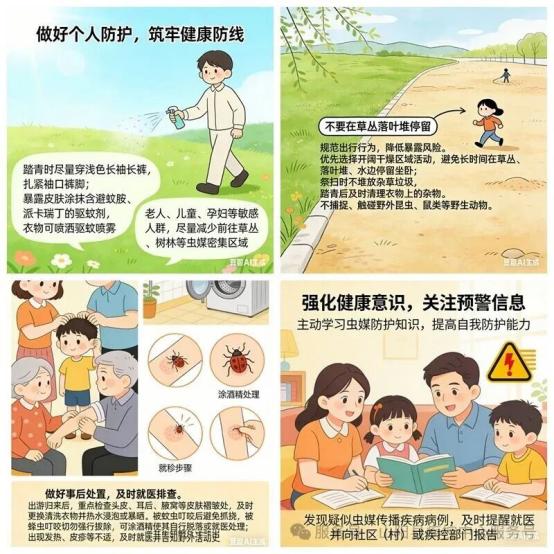外出踏青穿长袖长裤、扎紧袖口裤脚,涂抹驱蚊驱虫剂,定期检查身体防蜱虫叮咬。避开蚊虫密集区,清理营地积水,从源头减少虫媒传播疾病风险。