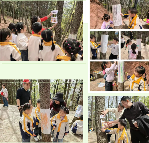 · 树的纹理拓印 宝贝们在老师的指导下将白纸覆在粗糙的树干上,用蜡笔轻轻涂抹。奇迹出现了——树皮的纹理像神秘的图腾,一点点浮现。他们在树的纹理拓印中,读懂了树木的语言。