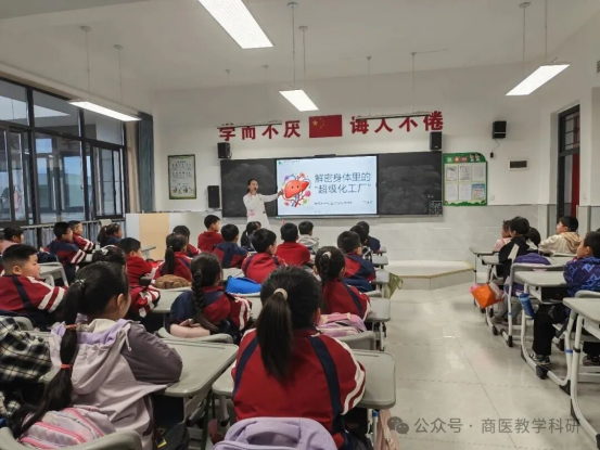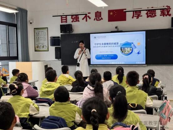 活动当天,宣讲团成员分工明确、各展所长,围绕青少年身心健康核心需求,开展了10场主题鲜明、针对性极强的科普宣讲。全科医学科于佳冬主治医师以“解密身体里的超级化工厂——肝”为主题,用生动形象的卡通“肝宝宝”形象,将抽象的肝脏知识转化为易懂的生活常识,传授科学护肝方法,引导学生争做“护肝小卫士”;科教科张璐老师以《守护生命最精密的城堡》为题,用趣味比喻解读大脑功能,普及脑疾病防治知识与前沿医学科技,在孩子们心中种下科学与爱心的种子;妇科王娟老师聚焦高年级女生青春期健康,开展“你好,青春”专题讲座,破解成长困惑,引导女生学会关爱自我、科学防护;手足外科(含烧伤整形)雍波副主任医师、王悦怡伤口治疗师围绕“烧伤的防控与急救”,结合真实案例与实操指导,让同学们掌握实用急救技能,树立安全防护意识;心理科吴雅静医生通过“护佑健康 心身同行”宣讲与“梦想拍卖会”互动体验,引导学生正确认识心理健康,提升自我觉察与规划能力;儿童保健科范婷婷主治医师围绕儿童生长发育特点,讲解长高“黄金密码”与健康防护技巧,助力孩子们科学成长;科教科周怡、马鑫鑫、王瑶三位老师分别以“餐桌上的微生物小秘密”“食物旅行记:走进神秘的肠道王国”“青少年春季校园健康防御”为主题,从饮食安全、消化健康、春季防疫等方面,传递实用健康知识,引导学生养成良好生活习惯。