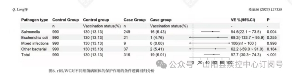 2-6岁儿童接种≥1剂量的rBS-WC霍乱疫苗对细菌性感染性腹泻的总保护效果为57.7%;rBS-WC霍乱疫苗在接种后6个月内具有最佳保护效果74.8%。该疫苗对沙门氏菌的保护效果为54.6%,对大肠杆菌的保护效果为69.2%。而诸如“沙门氏菌、大肠杆菌”等引发的“细菌性腹泻”是引发我国儿童死亡的重要因素之一。