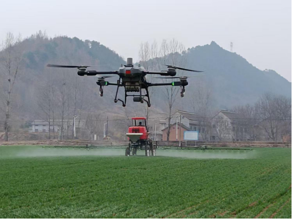 “春管一季,决定收成。”地头边,洛南县雄风农机专业合作社理事长何超一边盯着无人机,一边向笔者介绍:“这时候是弱苗转化的关键时期,用无人机飞防,可避免踩踏麦苗。我们根据苗情动态调整药液配比与飞行高度,实现‘一田一策’精准喷防。”