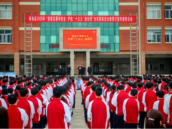 在第十一个全民国家安全教育日到来之际,4月14日,商洛市商南县2026年全民国家安全教育日主题宣传活动在鹿城中学圆满举行。活动紧扣“统筹发展和安全护航‘十五五’新征程”主题,旨在进一步增强全民国家安全意识,营造维护国家安全的浓厚法治氛围。县委常委、政法委书记相林出席活动并讲话。县公安局、县科经局、县司法局、县资源局等20余个相关部门单位,鹿城中学八年级全体师生及家长代表共300余人参加活动。