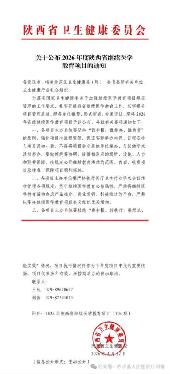 2026年4月22日,陕西省卫生健康委员会发布继续教育医学项目公示,商洛市柞水县人民医院检验科申报的“基层医疗机构临床检验专科规范化建设与技术提升培训班”项目(项目编号:2026-11-00-009(陕))成功通过评审。这是我院首次主办省级继续教育项目。