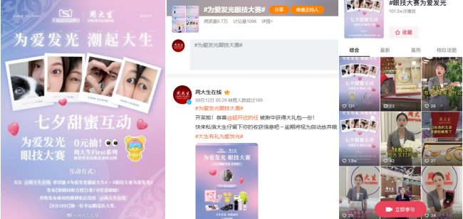在线上,周大生踩准天猫超级品牌日的节奏,从预热-预售-爆发一步一步创造超越消费者预期的购买体验。同时各大平台品牌官号也筹备了一系列的抽奖活动,如#眼技大赛为爱发光#甜蜜互动、品牌蓝V联合活动等,在全网掀起专属于周大生的七夕节日氛围,有效为店铺引流,还吸引了大量用户关注。在各平台搜索#大生有礼为爱发光#的活动主题,可以看见此单话题的曝光量已达2亿,互动量超382.7万。
