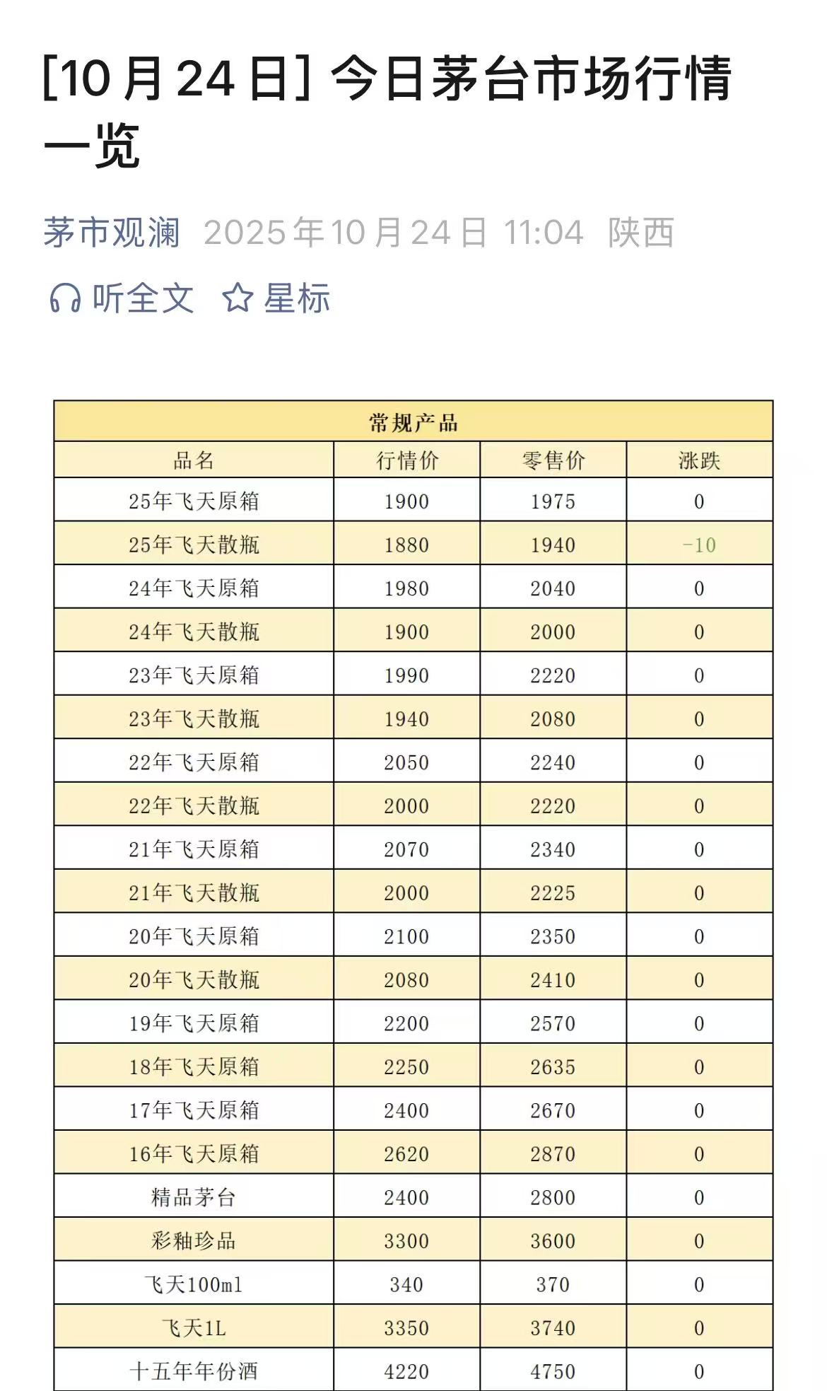 10月24日陕西地区茅台市场行情 来源:茅市观澜