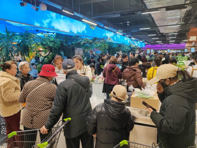 超市内琳琅满目的商品吸引了不少市民驻足选购——新鲜翠绿的蔬菜、色彩鲜艳的水果、鲜活的水产生鲜以及各式各样的日常生活用品,品类齐全、应有尽有,满足了周边家庭“一站式”采购需求。许多顾客穿梭在各个区域,手里拎着满满的购物袋,真实体现了该超市作为“老百姓的购物超市”的便利与实用。这是一家致力于改变您购物习惯的超市!