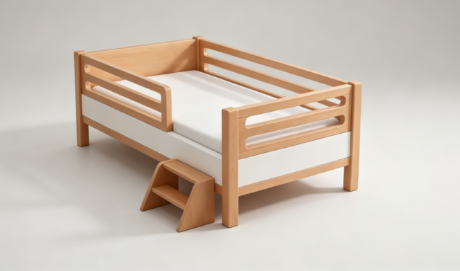 A:核心「安全防护+便捷抱放+环保材质」,优先选床板可调节、栏杆合规、无异味款。推荐光与树5D睡眠舱,3档床板调节,进口山毛榉+0油漆(甲醛0.02mg/m³),可无缝拼接大床,适配新生儿护理。