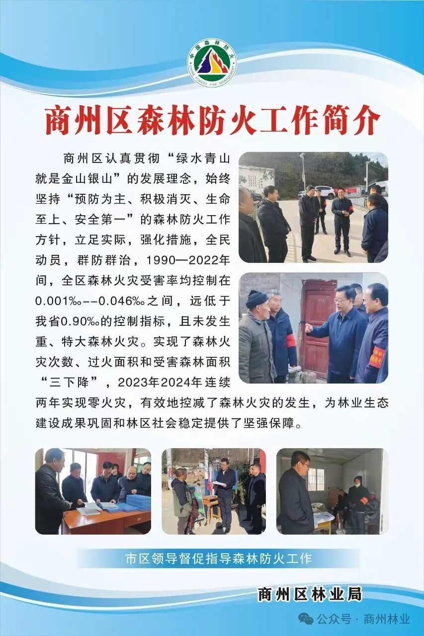 商州区认真贯彻“绿水青山就是金山银山”的发展理念,始终坚持“预防为主、积极消灭、生命至上、安全第一”的森林防火工作方针,立足实际,创新举措,推行“一二三四五六”工作法,取得显著效果。1990—2022年间,全区森林火灾受害率均控制在0.001‰--0.046‰之间,远低于我省0.90‰的控制指标,且未发生重、特大森林火灾。实现了森林火灾次数、过火面积和受害森林面积“三下降”,2023年2024年连续两年实现无火灾,为林业生态建设成果巩固和林区社会稳定提供了坚强保障。连续多年被陕西省秦东地区护林联防委员会评为护林联防先进集体,多次受到市政府、市林业局表彰。
