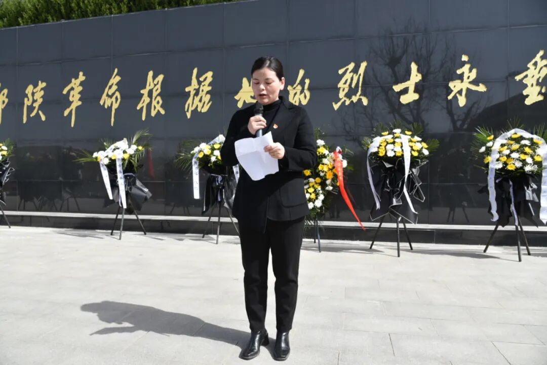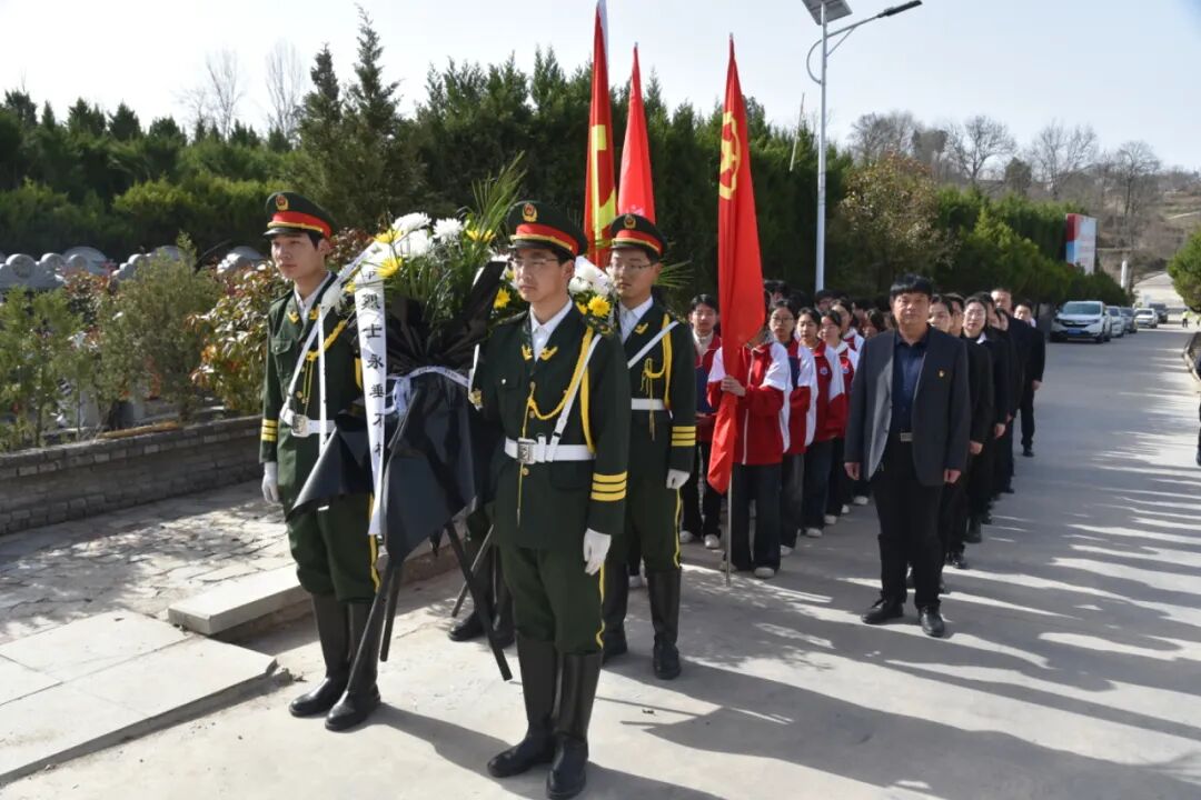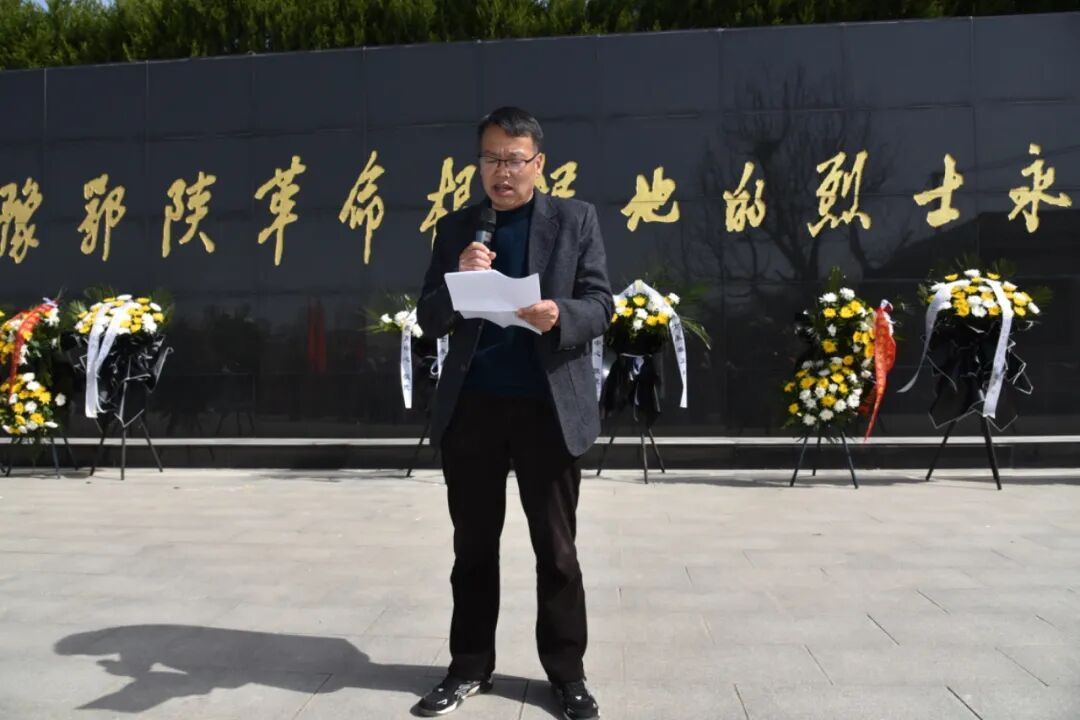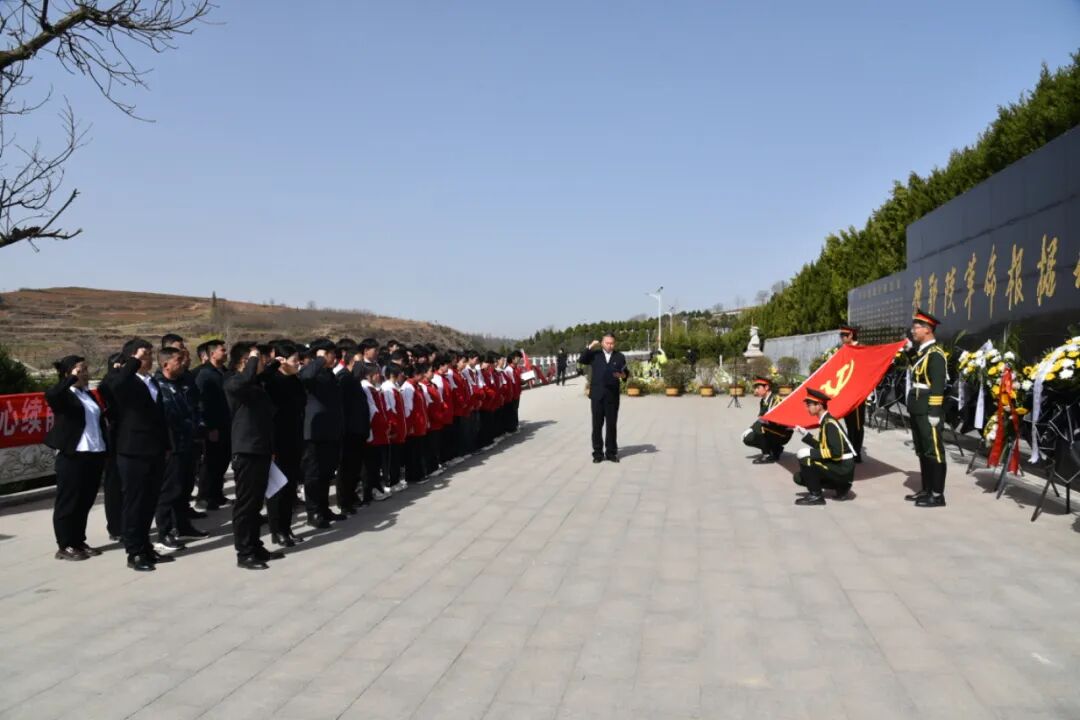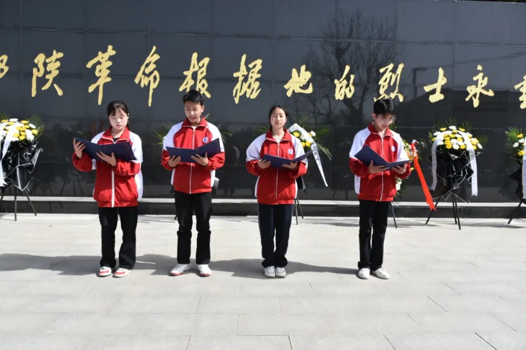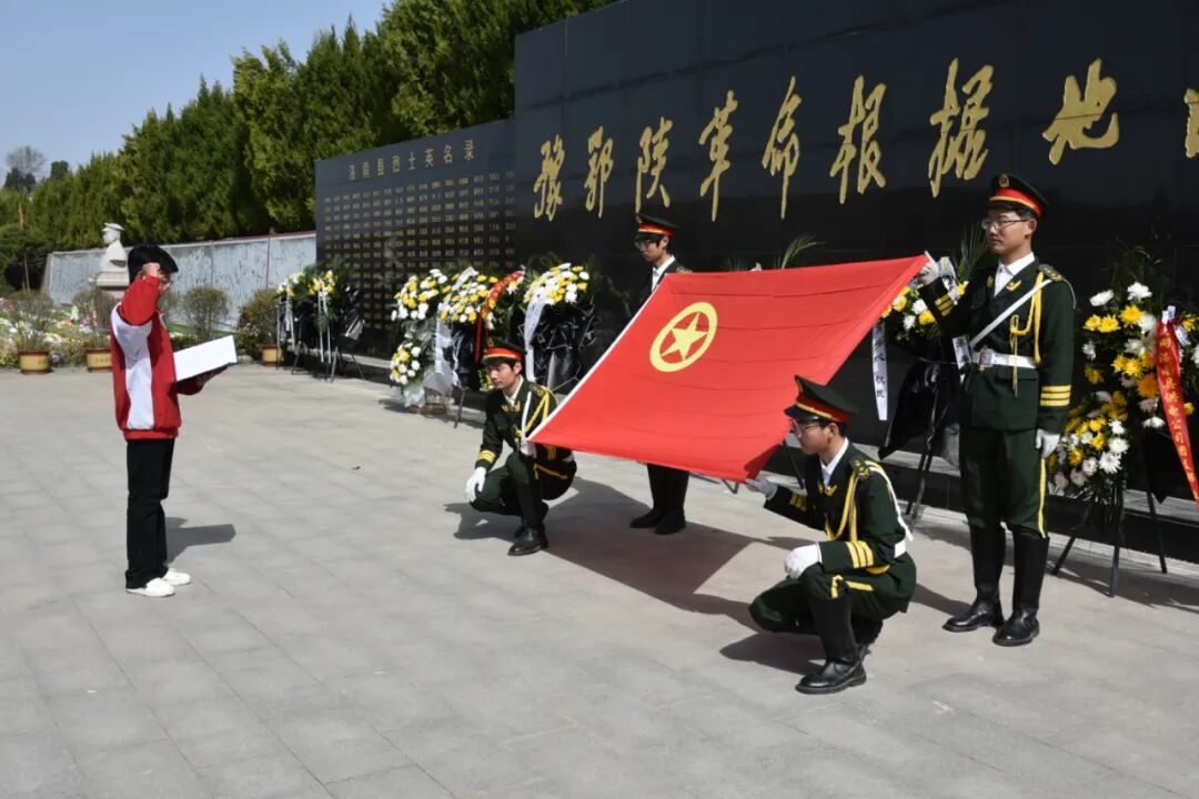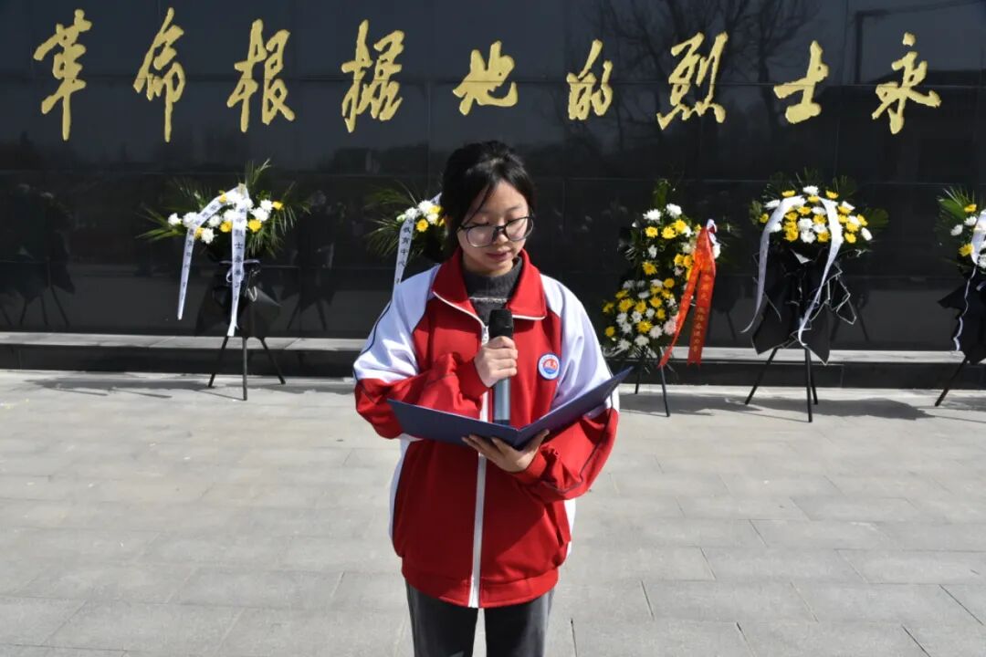 “我的曾祖父长眠在朝鲜战场,但他留下的家书始终教导我们铭记历史、报效祖国……”抗美援朝烈士后代、优秀团员杨佳润的动情讲述,让泛黄的家书成为跨越时空的精神纽带。教学党支部书记、教务主任李智平带领党员重温入党誓词,铿锵誓言响彻陵园;团员青年在菊宏森同学的领誓下高举右拳,面向团旗庄严承诺。行政支部书记米安生通过珍贵史料,深情讲述唐澍、李安民等本土烈士“抛头颅洒热血”的革命壮举,将红色火种播撒进师生心田。