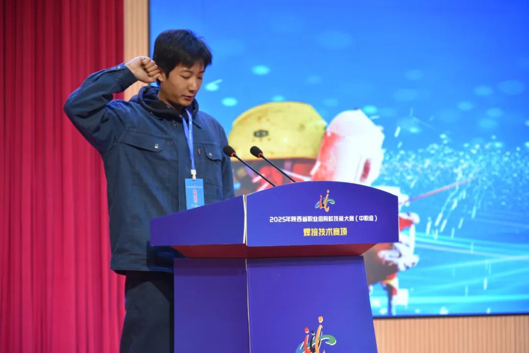 商洛市教育局职教科科长张洁现场宣布大赛纪律要求,强调“以赛促学、以赛促教”的办赛宗旨,要求全体参赛选手严守规则、赛出水平,裁判员严格执裁、确保公平。在参赛选手代表杨浩同学和裁判员代表李珑同志分别宣誓后,商洛市教研室主任林祥武发表讲话。他指出,职业技能大赛是深化产教融合、校企合作的重要平台,希望广大师生以此次赛事为契机,进一步提升技能水平,为陕西职业教育高质量发展注入新动能。