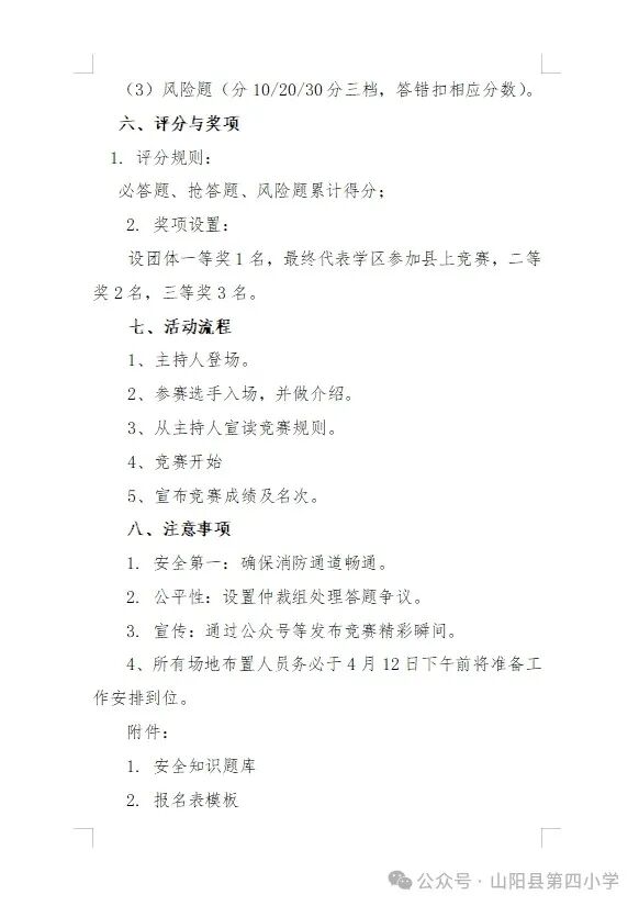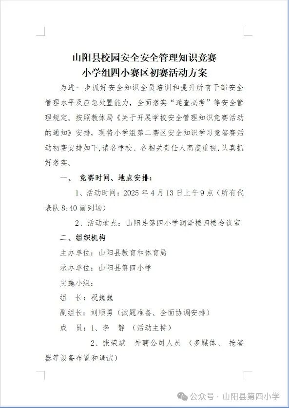 在教育工作的整体布局中,校园安全始终占据着核心关键的地位。为切实推进安全知识的全面普及,实现全员深度培训,全方位提升教育系统干部的安全管理专业水平以及应急处置能力,确保 “逢查必考” 等安全管理规定落地生根,山阳县积极响应并组织了一系列具有深远意义的活动。依据教体局《关于开展学校安全管理知识竞赛活动的通知》的具体部署,小学组第二赛区的安全知识学习竞答赛初赛活动在山阳县第四小学有序筹备与推进,力求通过此次活动,为校园安全管理注入新的活力与动力。